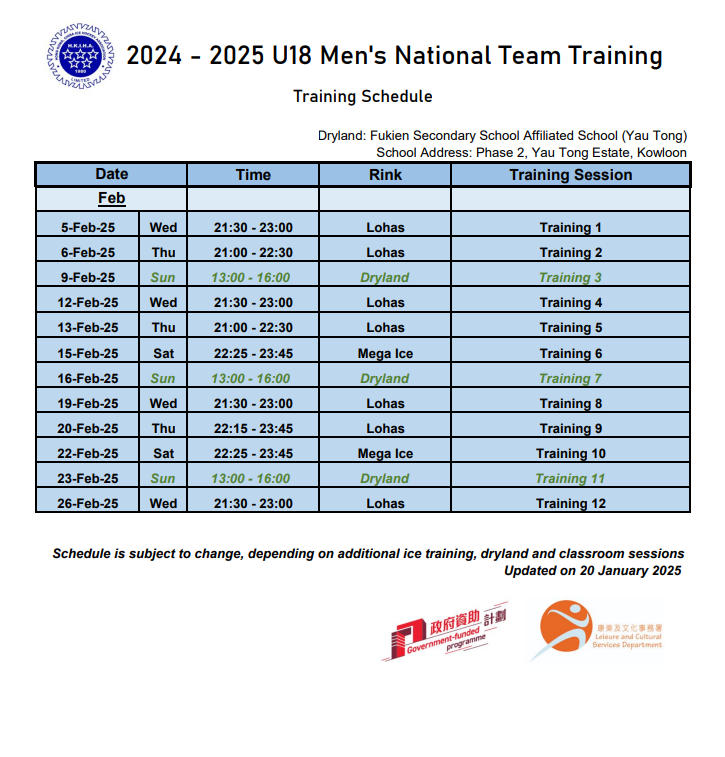 Please refer TRAINING SCHEDULE (subject to change) (Attachment 1) attached. ROSTER to be provided later after appointed as Coach